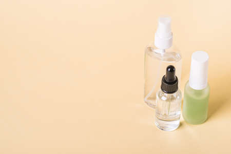 Set of natural cosmetics for morning face care, serum, cream and micellar water on pastel blurred background
