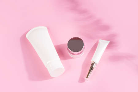 Set of skin creams on a pink background with shadows of leaves from sunlight.