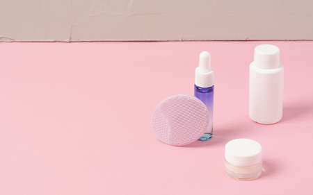 Facial cleansing brush and cosmetics, beauty treatment. Cosmetology and spa. Copy space, text