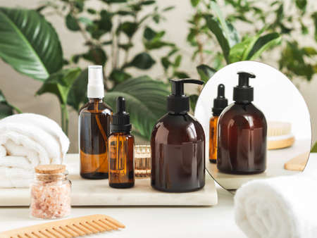 Skincare organic beauty product bottles, green plant leaves on gray background