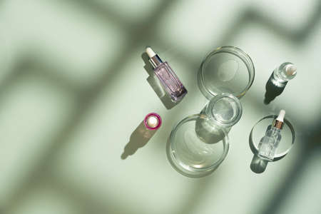 Different glass bottles with serum or oil on green background. Trending shadow. Cosmetic mockup. Top view with copy space. Flat lay.