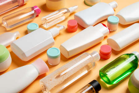 Personal care concept, cosmetics bottles, jars. Skin care products. Relax and spa. On a bright yellow background.