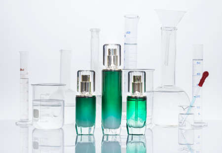 Cosmetic bottle containers with green herbal leaves and scientific glassware, Blank label package for branding mock-up, Research and develop natural organic beauty skincare product concept.