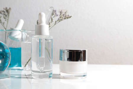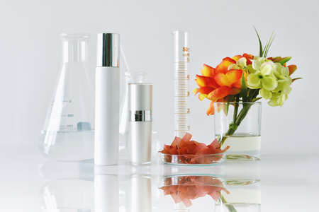 Natural skin care beauty products, Natural organic botany extraction and scientific laboratory glassware, Blank label cosmetic container for branding mock-up.