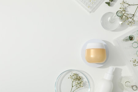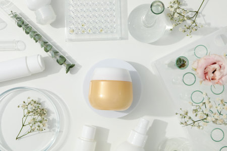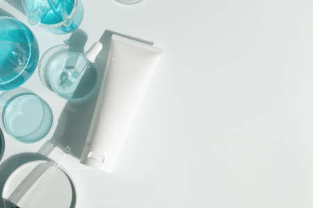 Concept of cosmetic research and organic skin care products, top view