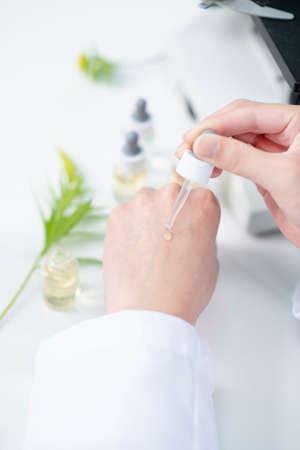 Beauty cosmetics sciences, Formulating and mixing skincare with herbal essence, Scientist testing a new organic beauty products on hand.