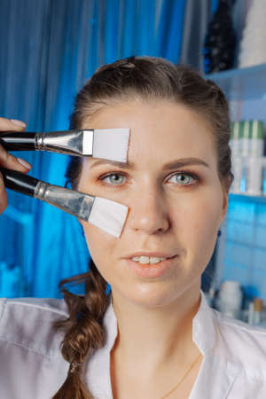 Professional beautician with brushes at his face.