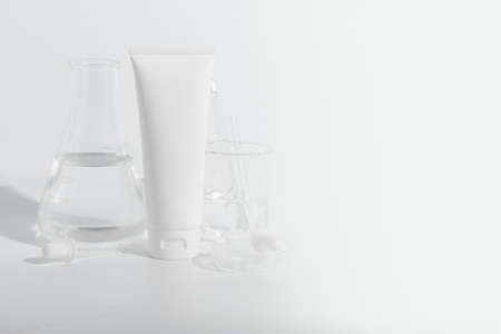 beauty spa medical skincare and cosmetic lotion bottle cream packaging product on white decor background with laboratory science test glass medicine