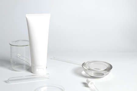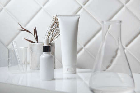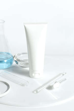 beauty spa medical skincare and cosmetic lotion cream bottle packaging on white decor background with science laboratory test equipment