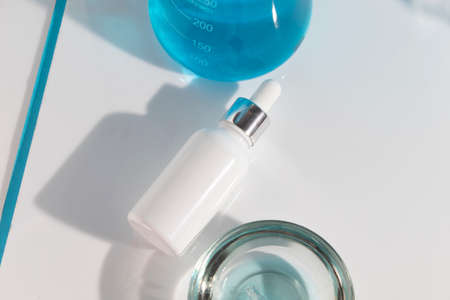 laboratory dishes and glassware on a lab table. fermentation, fermented beauty skin care. dropper bottle of solution or serum for anti age treatment.
