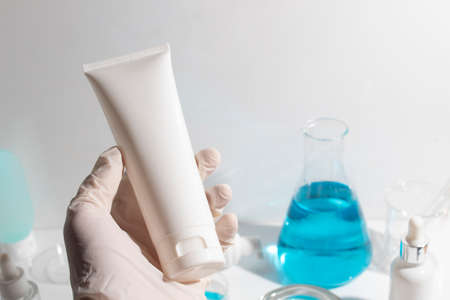 scientist with hand and mockup tube bottle for skin care cosmetic , product branding, cream lotion treatment, laboratory room testing experimental