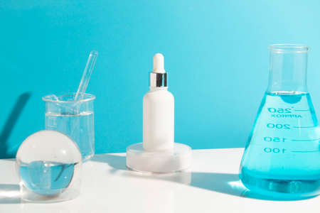 Cosmetics liquid gel serum lubricant hyaluronic acid with oxygen bubbles of glass laboratory glassware blue background
