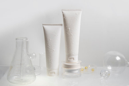 mockup tube bottle for skin care cosmetic summer sunscreen, product branding, cream lotion treatment in science laboratory