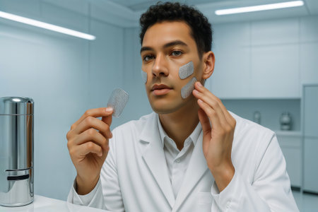 scientist and mockup tube bottle for skin care cosmetic , product branding, cream lotion treatment, laboratory room testing experimental