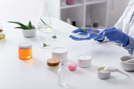cropped view of laboratory assistant in latex gloves holding tweezers and test plate near fresh plants and containers