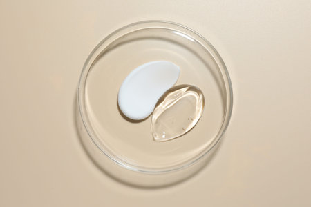 Petri dish on a beige background with a sample of a skin care product. A smear of green cream. Natural care cosmetics.