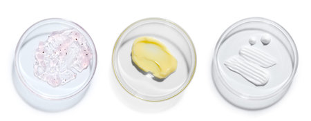 Petri dishes with cosmetic products on white background, top view