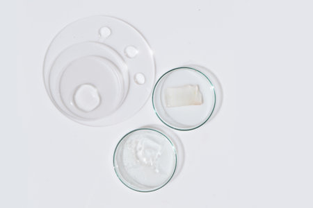 Glass petri dish with transparent pure serum for skin care on white background, top view. Concept laboratory tests and research, making and testing cosmetic