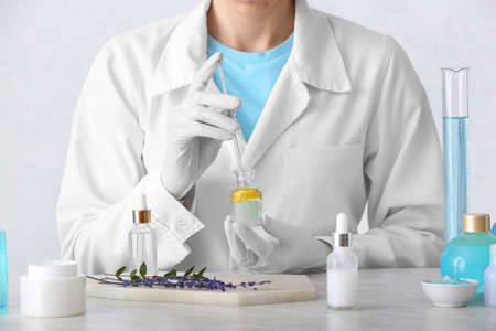 Dermatologist formulating and mixing pharmaceutical skincare, Cosmetic bottle containers and scientific glassware, Research and develop beauty product concept.