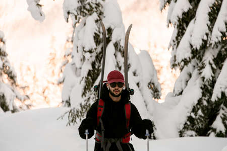 portrait of man in black jacket with ski tour equipment.