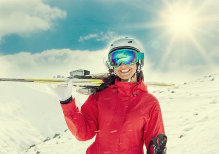 Young woman with ski on mountains during sunny day.