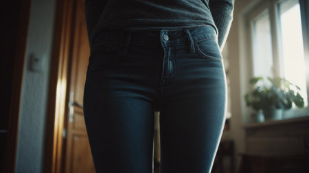 Unrecognizable woman presenting her casual beautiful outfit, long sleeved blue top and jeans.