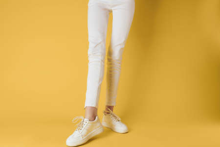 Lady denim fashion trousers. Girls yellow skinny pants on white wooden background. Female fashion apparel on sale.