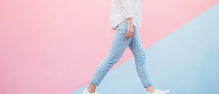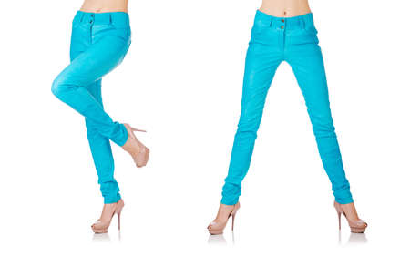 Female legs in blue fashion jeans isolated on white.Top view and copy space.