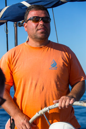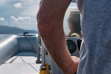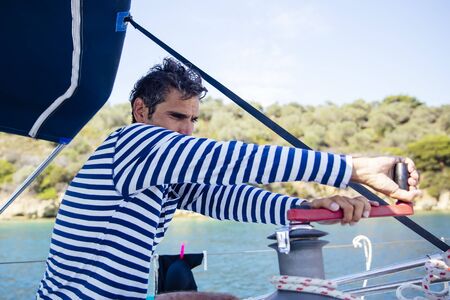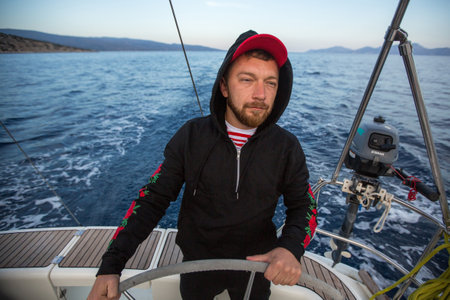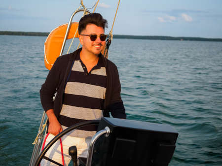 handsome black hair person steering wheel sailing yacht or sailboat on a vacations