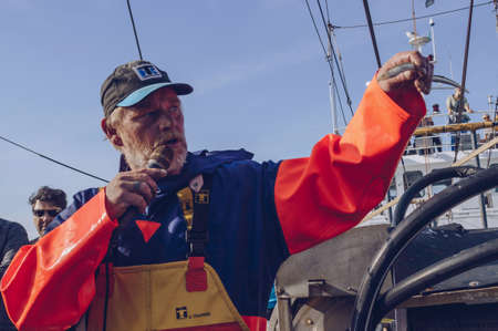 Texel, The Netherlands, October 13, 2018: fisherman is telling about particular fish species that is been caught in sea near Texel