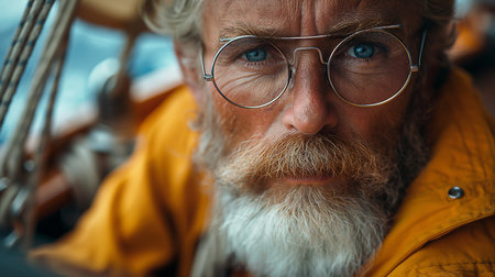 Close-up portrait of a senior man with glasses. He is sitting on a ship.