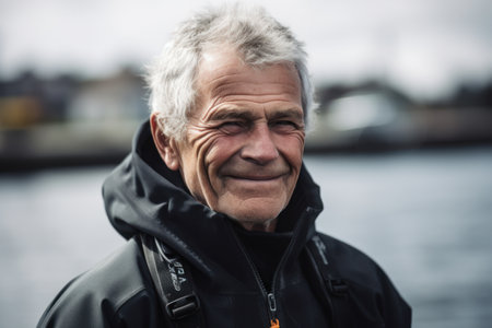 Happy senior man with blue eyes smiling in the rain at a coastal harbor.