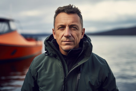 Portrait of a handsome middle-aged man in a green jacket on a background of an orange boat.