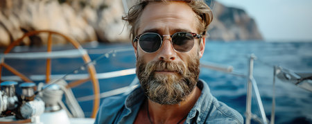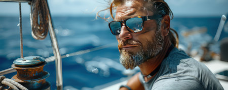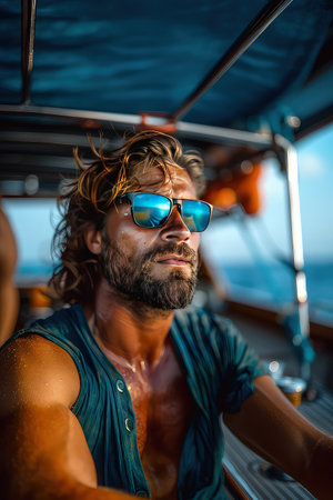 Bearded brutal handsome yacht owner in sunglasses on vessel deck looking forward in open ocean horizon while deep sea tuna fishing. Enigmatic mariner seeking the catch of a lifetime.
