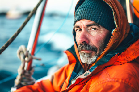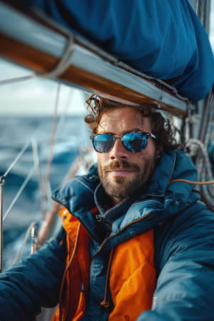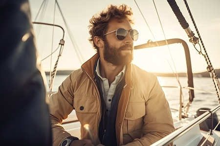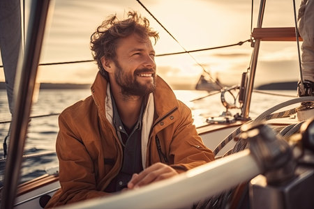 man skillfully navigates a sailboat on the open water, using his knowledge and experience to safely guide the vessel towards its destination. The wind fills the sails, propelling the boat forward as the man expertly adjusts the rigging and maneuvers the tiller. Generative AI