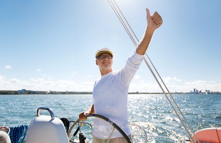 sailing, age, tourism, travel and people concept - happy senior man in captain hat on steering wheel and showing thumbs up sail boat or yacht floating in sea