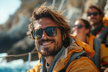 Cheerful Individual Sailing in Bright Yellow Jacket With Friends on Sunny Day