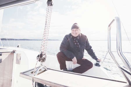 Senior man wearing jacket, scarf and hat, turning winch handle on yacht stern adjusting jib during perfect autumn day under sails - sailing holidays concept