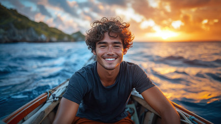 Generative AI Image of Asian Man Sitting Smiling on Boat in Sea Ocean Landscape at Twilight