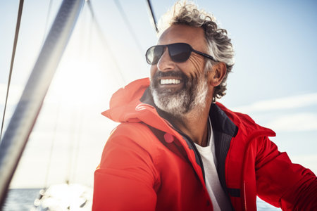 Portrait of a handsome senior man in red jacket and sunglasses on the deck of a sailing yacht