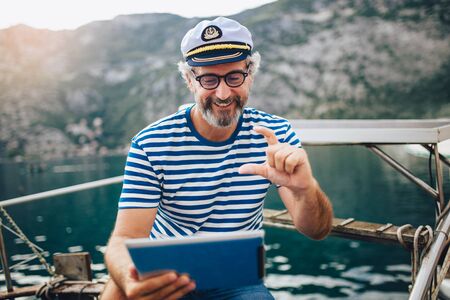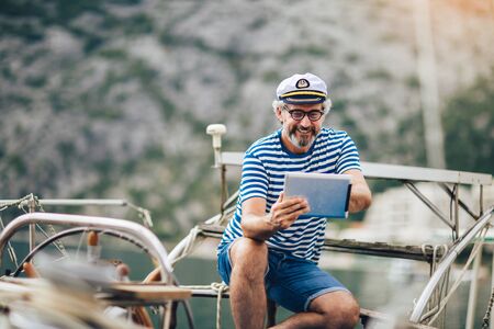 Mature man standing on the deck of his boat and using digital tablet on a sunny afternoon.