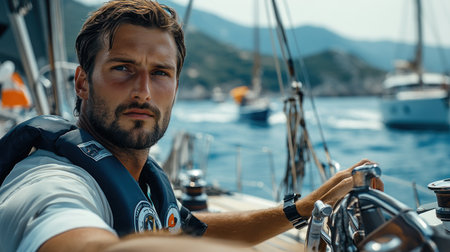 Focused man steering sailboat, harbor view, adventure