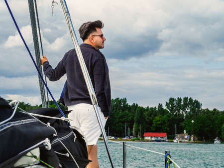 handsome person standing on a sailing yacht bow and looking a side in a cold day on a lake, back view