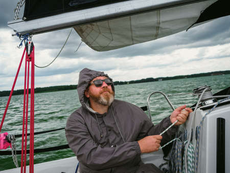 sailing on a yacht in rainy weather. adult man using a winch to pull a rope on a sailboat or sailing yacht to control a yacht sail, the yacht sails in a thunderstorm on a rainy autumn day