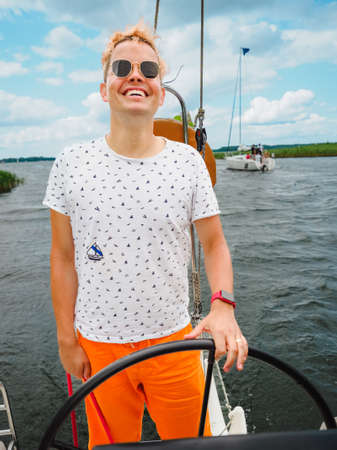 handsome smiling blond hair young man steering wheel a sailboat or sailing yacht through tha canal on a lake during his summer sailing trip