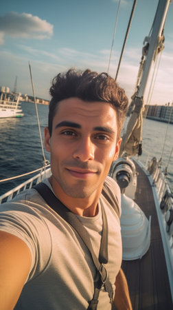Generative AI : Guy gets a selfie during his vacation at sea people holiday nature and lifestyle concept