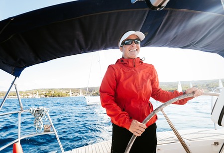 Attractive strong woman sailing with her boat