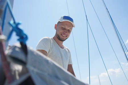 Sailor demonstrating precision in adjusting sail ropes olympic sailing sport concept
