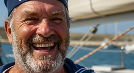 Happy Senior Sailor Laughing with Beard on Boat