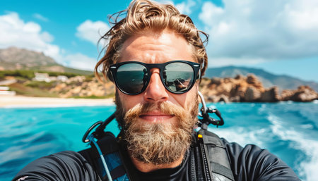 Attractive, Bearded Man Wearing Sunglasses, Smiles for Selfie While Scuba Diving in Tropical Water